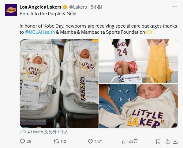 14、湖人官方:“出生于紫金军团。为纪念科比日,感谢Mamba & Mambacita 体育基金会的帮助,新生儿将收到特别护理包。”